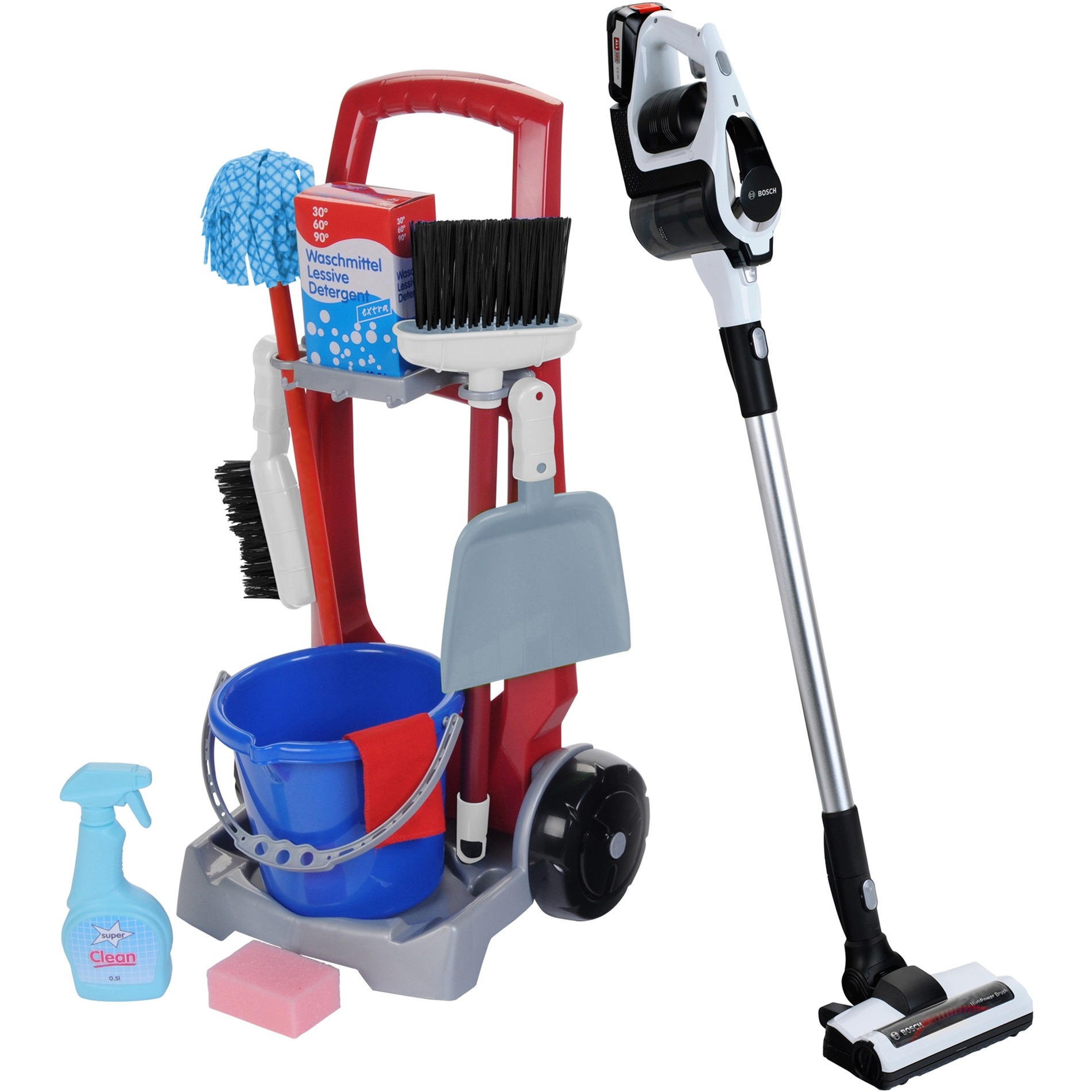 Con questo set di elettrodomestici giocattolo di Theo Klein, la squadra di pulizia junior è ben attrezzata. Il punto forte è, naturalmente, l''aspirapolvere alimentato a batteria nel design Unlimited di Bosch con attacco rimovibile e interruttore di accensione e spegnimento. Inoltre, c''è il carrello per la pulizia, che contiene molti accessori: una scopa, un set di spazzatura, una scopa, un secchio, detersivo, flacone spray e stracci per la pulizia.