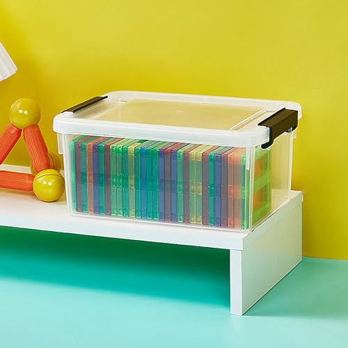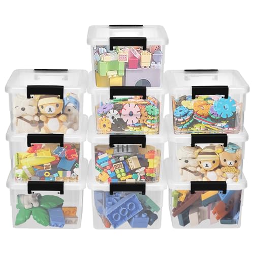 Queta Confezione da 10 scatole portaoggetti con coperchi in plastica trasparente impilabili, scatole per scaffali, giocattoli, scatole con manici, 1 l