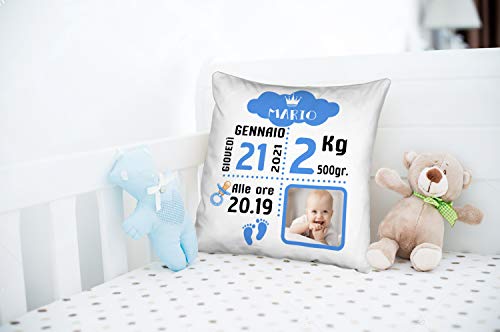 Quickgadget Idea Arredo Casa Regalo Cuscino Nascita Neonato Bambino Personalizzato con Nome, Foto e Dati della Nascita, per Maschio. Nuvola King