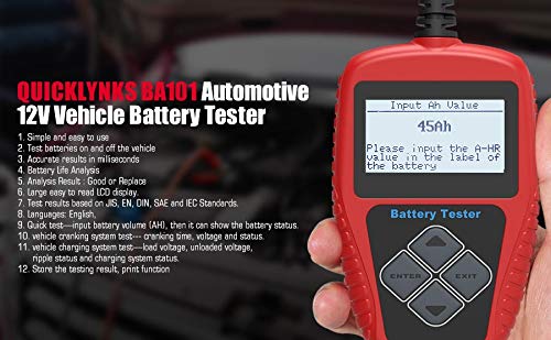 QUICKLYNKS Il tester della batteria BA101 12V è progettato per testare le condizioni della batteria automobilistica utilizzando il metodo di conduttanza;