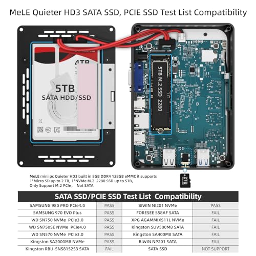 【Memoria e archiviazione, maggiore capacità espandibile】 RAM LPDDR4 integrata da 16 GB, 512 GB (256 GB eMMC a bordo + 256 GB SSD), con uno slot per schede Micro SD che può essere aggiunto separatamente per espandere l'archiviazione fino a 2 TB, SSD M.2 interno NVMe 2280 fino a 4 TB, supporto HDD/SSD SATA fino a 4 TB.