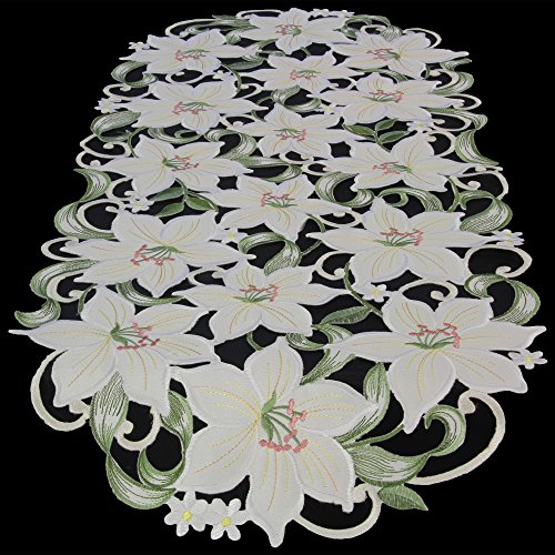 Quinnyshop Runner da tavola con Ricamo Aperto di Gigli Bianchi, centrino di Diverse Dimensioni, in Poliestere, Colori: Bianco e Verde, Poliestere, 40 x 90 cm