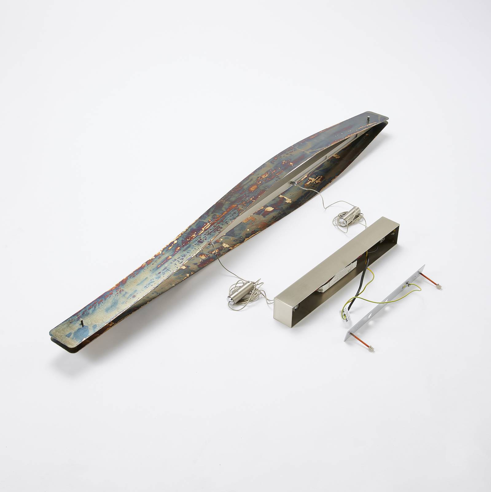 Lampada LED a sospensione dimmerabile Lian con superficie ossidata - CRI > 90 La superficie ossidata rende la lampada LED a sospensione Lian un vero e proprio richiamo visivo nel soggiorno o nella sala da pranzo. Il paralume dell'apparecchio è fissato ai due cavi d'acciaio sotto forma di un elegante anello. I paralumi in alluminio leggermente curvati sono stati intelligentemente posizionati uno di fronte all'altro, in modo che le loro superfici interne siano visibili. Queste sono infatti illuminate efficacemente dalla luce LED incidente. Ciò mette in risalto l'insolita superficie. Sotto la superficie ossidata si nasconde un metallo d'impatto dorato che è stato trattato con uno speciale attivatore e poi ossidato. In questo modo si creano nuove superfici da apparecchio a apparecchio, rendendo ogni prodotto unico. Inoltre, l'uplight e il downlight decorativi mettono ancora una volta in risalto l'apparecchio. Tuttavia, Lian non ha solo molto da offrire dal punto di vista visivo, ma anche da quello tecnico. Nella sospensione a cavo d'acciaio è integrato un meccanismo saliscendi facile da azionare che permette di regolare l'altezza della lampada a sospensione (da 105 a 195 cm). Collegando all'apparecchio un dimmer esterno a taglio di fase discendente o anteriore, è possibile regolare la luminosità dei LED in modo continuo e dimmerare la luce. Se apprezzate i materiali di alta qualità e la buona lavorazione e preferite un prodotto di illuminazione che vi piacerà a lungo, questa lampada LED a sospensione Lian di produzione tedesca è senza dubbio la scelta giusta.