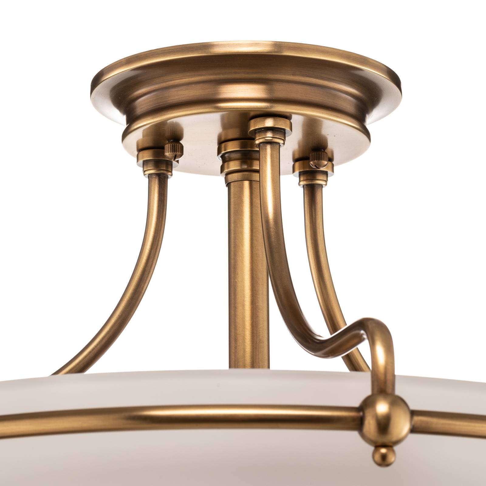 Splendida plafoniera a soffitto Griffin - colore telaio ottone anticato La plafoniera a distanza Griffin è impressionante anche quando è spenta. Visivamente affascina con una sospensione in metallo, che è stato invecchiato con una finitura chiamata ottone. I bracci leggermente curvi si annidano contro la parte superiore del grande vetro rotondo della lampada. Il vetro inciso è dipinto di bianco all'interno, in modo che nulla ostacoli una riflessione ottimale della luce. La sorgente luminosa ideale per l'illuminazione di base.