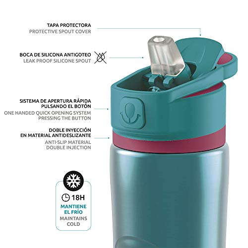 Bottiglia riutilizzabile in Acciaio inossidabile. Grazie alla sua doppia parete mantiene costante la temperatura e mantiene le bevande fresche fino a 24 ore e calde fino a 12 ore.