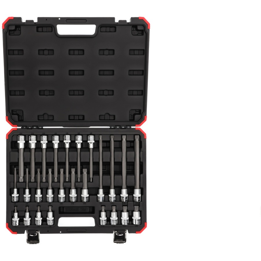 Il set di chiavi a bussola R68003026 di GEDORE rosso contiene 26 chiavi interne multi-dente M5 - M16 con azionamento da 1/2" in quattro diverse lunghezze.