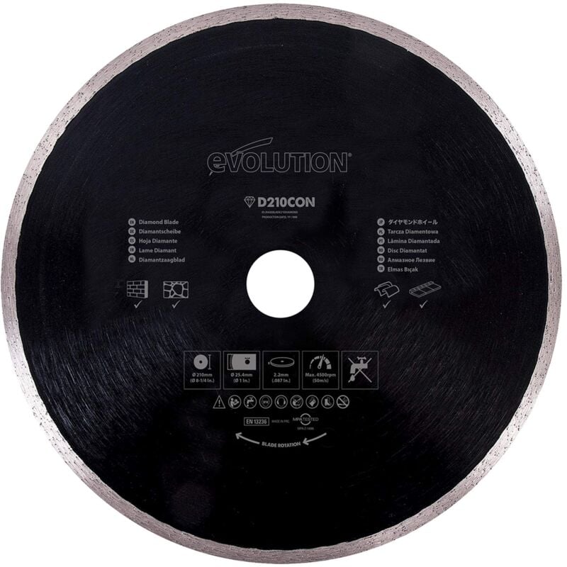 Perfetto per tagliare tegole e ardesia temprato lama Body garantisce la lama corre vero per più a lungo Alta concentrazione di diamante per una lunga vita. Adatto solo per l' uso con un Evolution Rage Saw Rapida pulita e precisa Cuting capacità evoultion Rage 3-S 210 mm diamantato lama di ricambio di alta qualità continua cerchio lama diamantata. Trasforma il tuo mitre Saw in un tagliapiastrelle scorrevole. Taglio in ceramica, calcare, marmo, pietra naturale, porcellana e ardesia. Diametro della lama 210 mm Velocità massima 8000rpm alesaggio 25.4 mm taglio 2.5 mm