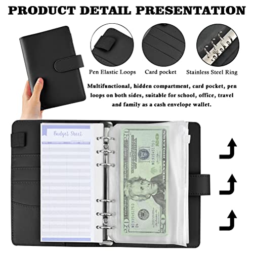 Raccoglitore ad anelli in pelle A6 quaderno budget raccoglitore note raccoglitore in pelle quaderno budget raccoglitore con borsa con cerniera trasparente, foglio budget e adesivo (nero)