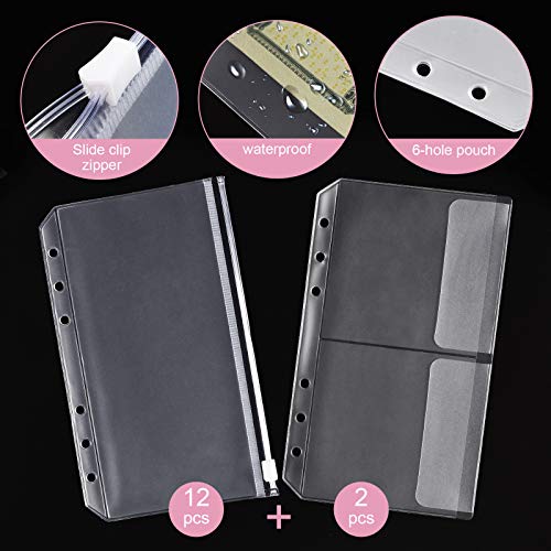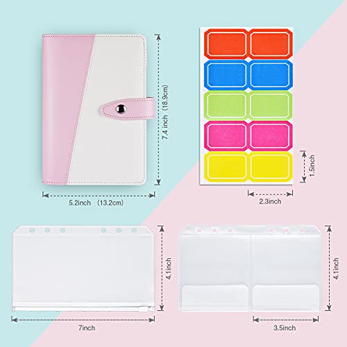 Raccoglitore documenti,14 tasche A6 con custodia in pelle per quaderni, cash stuffing, raccoglitore documenti senza anelli, raccoglitore ad anelli trasparente, per agenda con etichette (rosa e bianco)