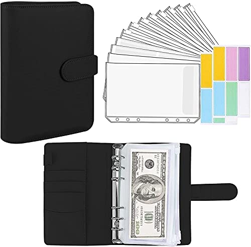Raccoglitore A6, formato A6, raccoglitore ad anelli in pelle PU, ricaricabile, 12 buste trasparenti in PVC, organizer per contanti con etichette adesive (nero)