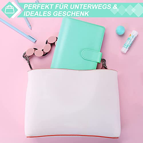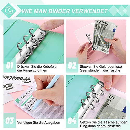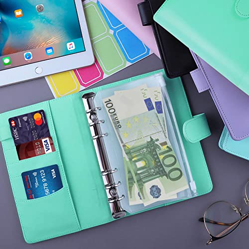 A6 Raccoglitori ad anelli, A6 Raccoglitore Documenti in Pelle con 12 Buste A6 Trasparenti, Fogli di Budget, Adesivi per Etichette Dim 20 x 14 x 3 cm Multi Tasche per Banconote Biglietti Carte, Verde
