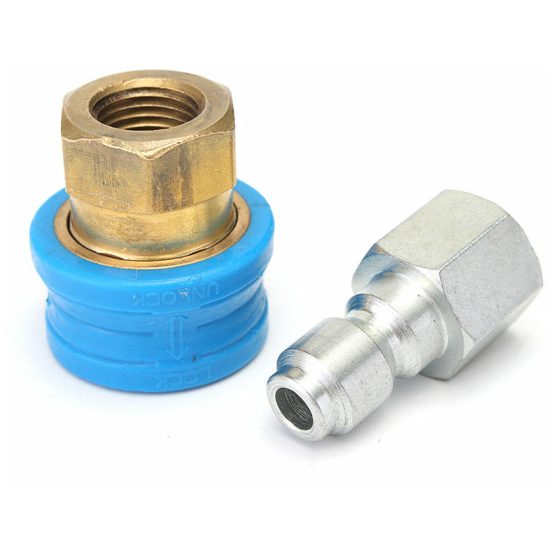 Nome: Raccordi a sgancio rapido Specifiche: Modello: 597085 Materiale: ottone e rame Pressione massima: 280 bar-4000psi Flusso massimo: 40 LPM Temperatura massima: 100°C 1/4F x 11,6 mm Caratteristiche: Mini raccordi compatti ad alta e bassa pressione con sgancio rapido Sistema di connessione facile da usare < br/> rende il cambio degli accessori facile e veloce. Dotazione: 1 attacco rapido