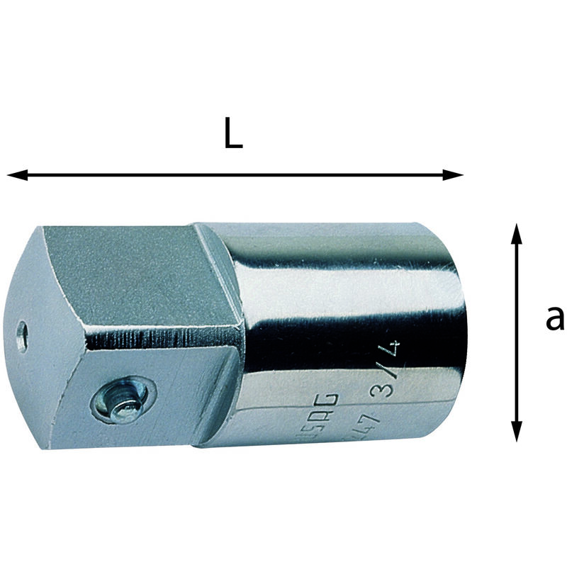 RACCORDO AUMENTATORE Acciaio speciale altamente legato al Cromo Vanadio Esecuzione cromata Codice Attacco quadro femmina Attacco quadro maschio L mm a mm U02470001 1/2 3/4 47 25