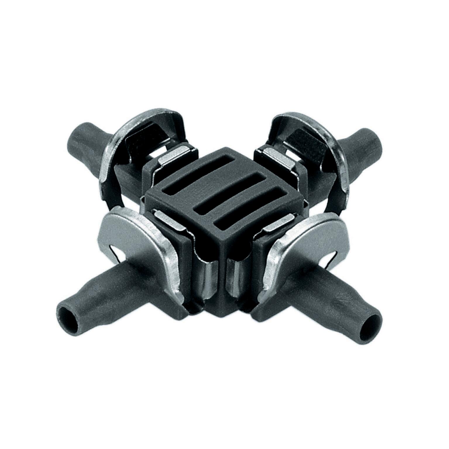 4 vie. Linea secondaria. Confezione da 10 pezzi. Ideale per dividere la linea secondaria in piu' linee. Permette il collegamento di piu' irrigatori alla stessa linea secondaria