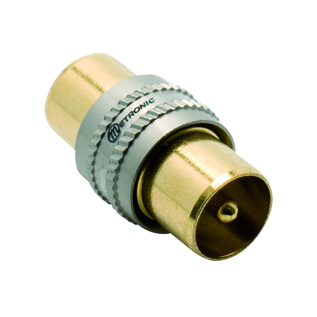 Attacco maschio, blindato. Permette il collegamento di due cavetti tv con spinotto coassiale femmina diametro 9.52 mm