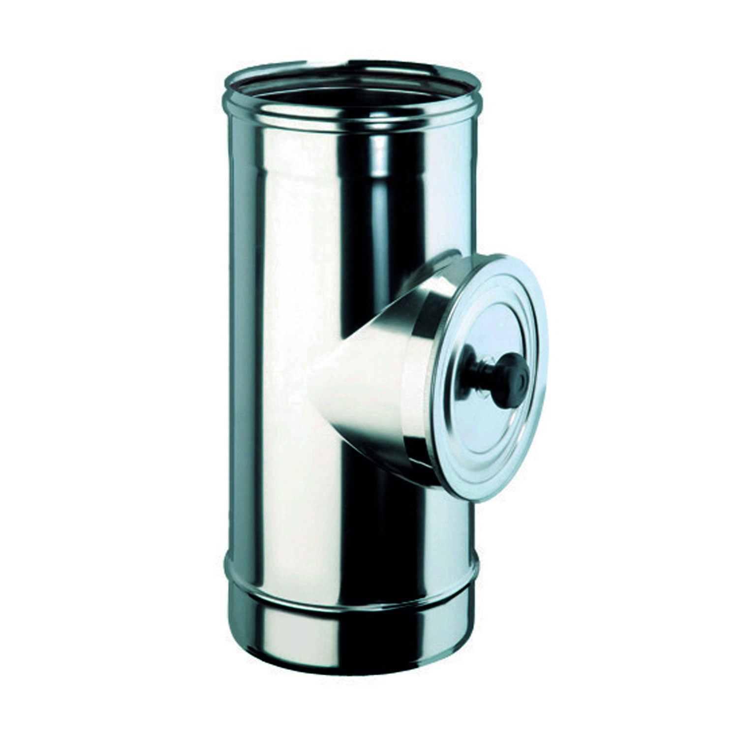Ispezione tonda per mono parete Dn 100 mm. Utilizzato sotto l'elemento a T 90 nel tratto verticale della canna fumaria permette la puliza della stessa.. Svitando lo sportello tondo si riece, con atrezzi idonei pulire la canna fumaria.