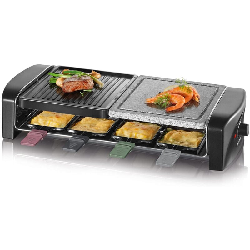 Superficie grill combinata con pietra naturale per una perfetta conservazione del calore. 8 mini padelle con manici colorati con rivestimento antiaderente. 8 persone. Potenza: 1400 w. Involucro in plastica di alta qualità. Facile da pulire. Luce pilota. Termostato variabile. Colore nero.