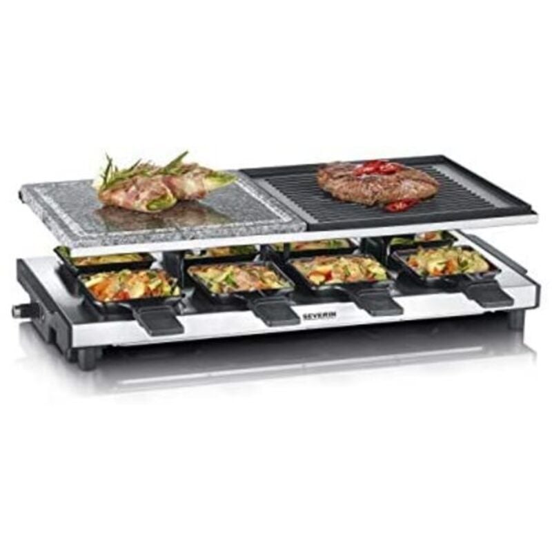 Apparecchio per raclette/grill con pietra di cottura Severin 2373 per 8 persone. Raclette, grigliata o cottura su pietra naturale: quale sarà il tema della vostra prossima serata con gli amici? Superficie di cottura combinata (48,5 x 24 cm) per una garanzia di sapori diversi! Pietra da cucina naturale per trattenere il calore a lungo termine: il cibo grigliato viene cotto delicatamente e rimane tenero e succoso. Piastra di cottura antiaderente reversibile: 1 lato liscio e 1 lato rigato per grigliate sane e senza grassi. Tipo di prodotto: dispositivo per raclette/grill/pietra per grigliare. Tipo di dispositivo: Raclette multifunzione. Numero di persone: 8. Potenza (W): 1500. Termostato regolabile: sì. Wok: no. Griglia: sì. Pietra refrattaria: sì. Crepiera: no. Materiale del dispositivo: plastica. Piastra antiaderente: sì. Piastra reversibile: sì. Altro(i): Piastra antiaderente reversibile rigata e liscia. Numero di tazze: 8. Accessori inclusi: 8 padelle antiaderenti. Indicatore di