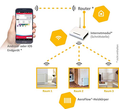 Termostato programmabile tramite display integrato (facoltativamente controllabile tramite app App per Android o iOS: " Modulo de Internet FlexiSmart" necessario, non incluso nella dotazione), inoltre sono disponibili piedini o carrello