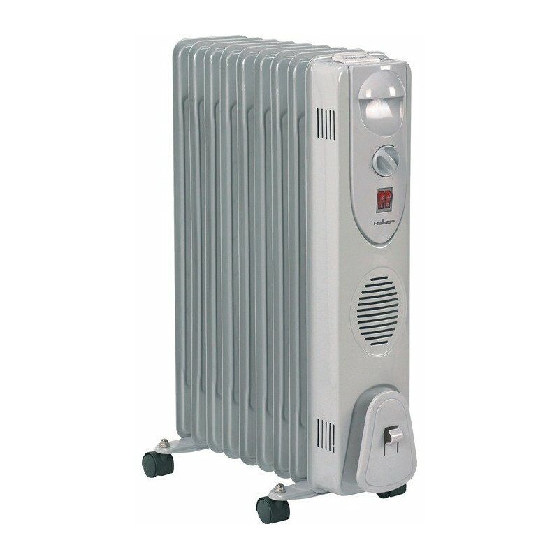 9 costole · rapida generazione di calore · Rulli/maniglia di trasporto · Interruttore di accensione/spegnimento · 3 stadi di commutazione: 0,8 kW / 1,2 kW / 2 kW · interruttore rocker illuminato · Termostato per regolazione stepless · Protezione da surriscaldamento · Avvolgimento dei cavi · Colore: grigio chiaro Altre caratteristiche tecniche: · Versione: riempita d'olio