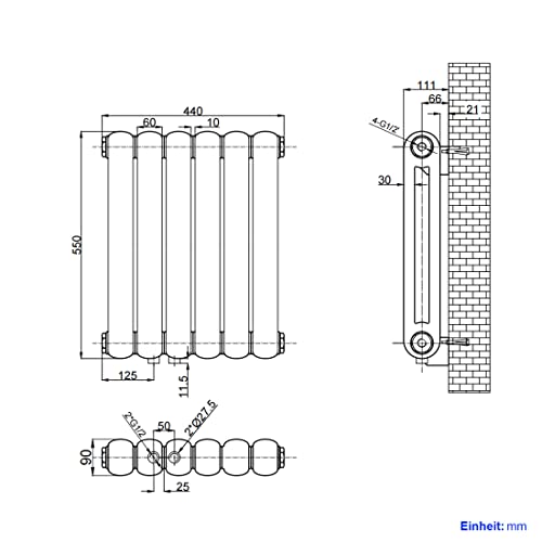 Specifiche: dimensioni riscaldamento: 550 x 440 mm (altezza x larghezza), potenza in uscita: 549 W, numero di tubi: 6 x 2, campo di applicazione: 5 ㎡, numero di strati: doppio strato, peso radiatore: 11,8 kg