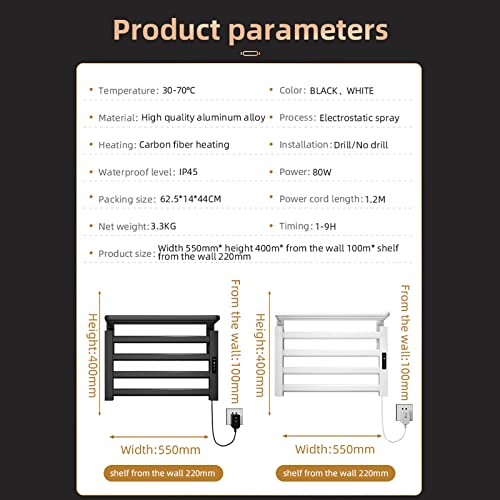 ★ Scaldasalviette: lo scaldasalviette è realizzato in resistente lega di alluminio, facile da pulire e senza preoccuparsi di eventuali problemi di ruggine. L'uso di uno scaldasalviette può ridurre lo stato umido dell'asciugamano, evitare efficacemente gli odori, ridurre il numero di pulizia degli asciugamani, aumentare la durata dell'asciugamano e offrirti un ambiente di vita sano e igienico