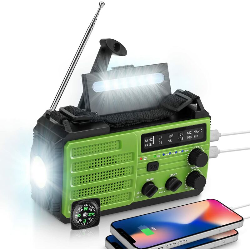 Batteria al litio a lunga durata da 8000 mAh - La radio dinamo ha una batteria al litio integrata di grande capacità da 8000 mAh. Quando la batteria è completamente carica (8 ore), la radio o l'altoparlante possono funzionare per 72 ore (volume medio) 【Luce di lettura pieghevole a 90° e torcia super luminosa】Se sei un appassionato di attività all'aperto o hai bisogno per andare dove non c'è luce, questa radio a energia solare con torcia (3 modalità) è una buona scelta. La portata massima di illuminazione è superiore a 10 m. Capovolgi il pannello solare di apertura e i 6 LED integrati possono fungere da luce di lettura e possono essere utilizzati per escursioni, campeggio o emergenze. 【4 modalità di ricarica】 Il maltempo provoca sempre interruzioni di corrente. Questa radio solare a dinamo offre 4 metodi di ricarica: ① Manovella - Ruota la manovella per generare elettricità. ② Pannello solare: protegge e riattiva la batteria mentre la radio è in carica. ③ Ricarica rapida USB - È