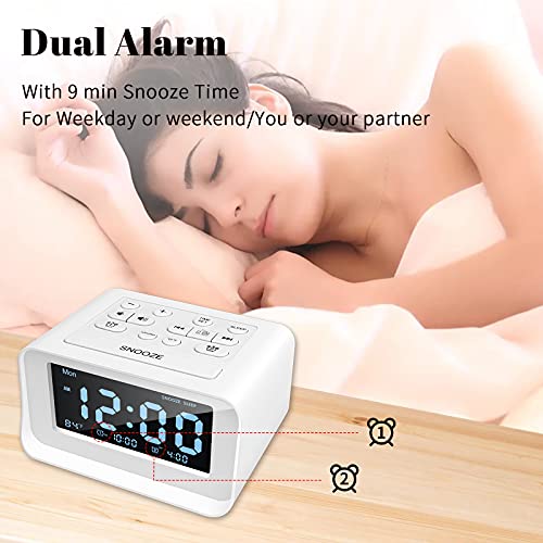 Radiosveglia con Doppio Allarme, Sveglia Digitale da Comodino con 2 Porte di Ricarica USB, Dimmerabile 0-100%, Timer di Spegnimento Radio FM, 6 Suonerie, Termometro Interno, Funzione Snooze (Bianca)