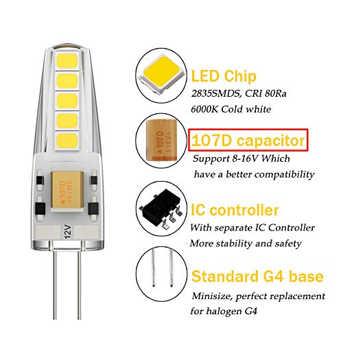 Sicure e Stabili - Con la capacità elettrica di 107D, le lampadine G4 possiedono una compatibilià più forte, adatte al voltaggio ampio: 6-18V.