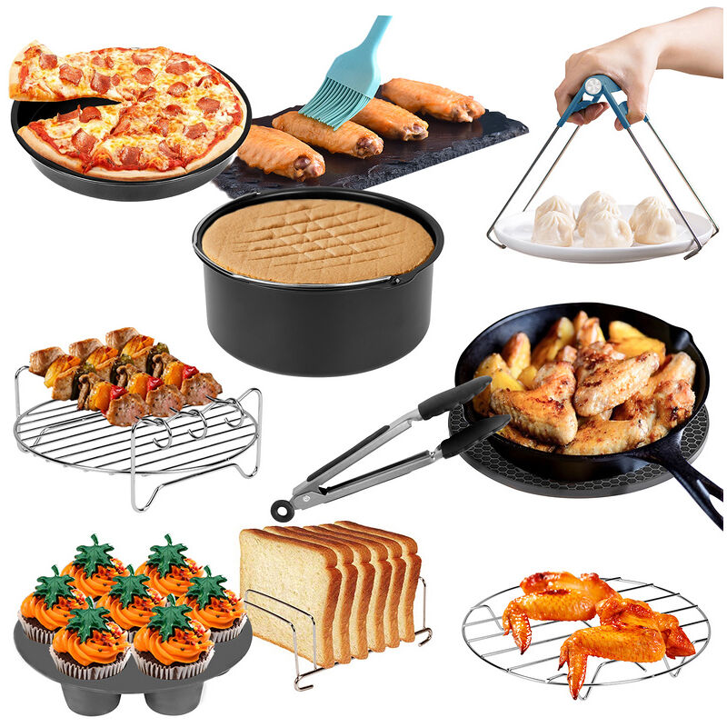 Il nostro set offre una serie completa di accessori per la friggitrice ad aria calda, comprendente tutto il necessario per cucinare senza dover spendere molto tempo e denaro nell'acquisto separato. E 'molto adatto per tutte le dimensioni friggitrice ad aria calda, senza sprecare lo spazio friggitrice ad aria calda, godere del divertimento di cottura e soddisfare le esigenze di tutta la famiglia.Se amate la cucina, non si dovrebbe perdere l'opportunità di possedere! 【Accessori per friggitrice ad aria calda da 12 pezzi】Il set di accessori comprende secchiello per dolci (lato più lungo 17,8cm), vassoio per pizza (lato più lungo 17,8 cm), supporto in metallo (Ø17,8 cm), Portagriglia (lato più lungo) lato 17,8cm), portapane (15,4 cm), tortiera (18 cm), base in silicone (18 cm), clip anti-caldo, guanti in silicone, pennello per olio, pinza per alimenti, 100 carte da forno. 【Adatto alla maggior parte delle marche di friggitrici ad aria calda】La dimensione del nostro set di accessori per