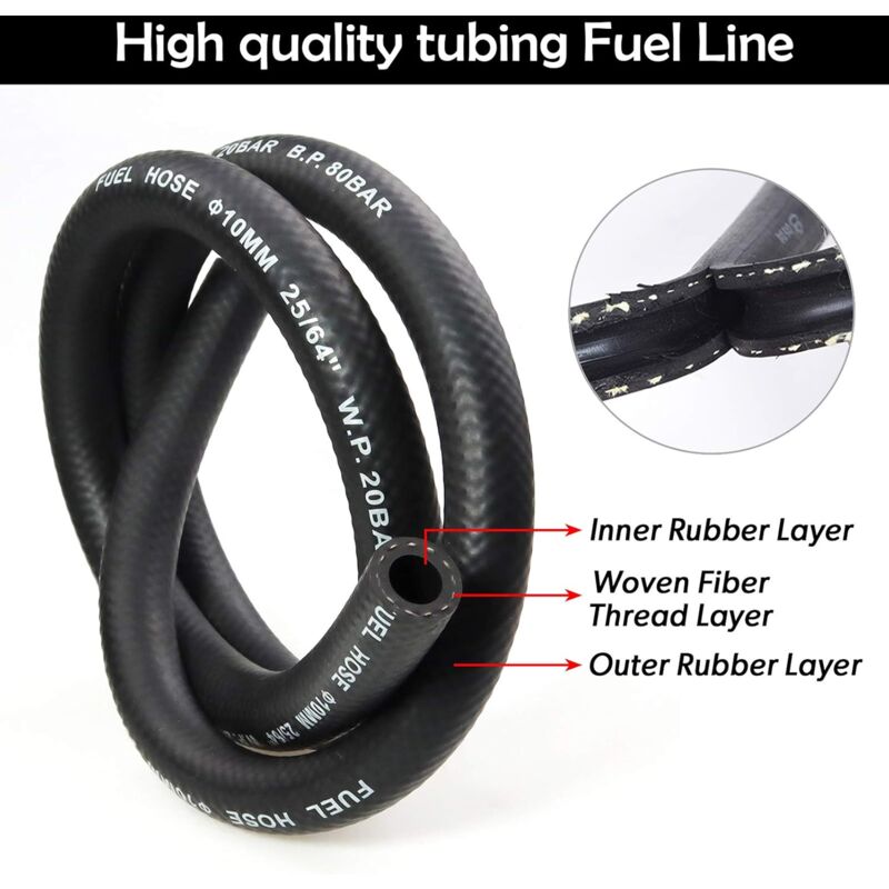 5 fascette stringitubo. Le dimensioni delle due parti sono compatibili tra loro. Puoi usarli direttamente senza acquisti aggiuntivi. ♥ Parete del tubo ispessita ◀ Lo spessore della parete è 2,94 mm. Resistente all'olio, al freddo e all'etanolo. Il tubo spesso ti fa sentire a tuo agio, non preoccuparti di perdite. LUNGA DURATA◀ Grazie al materiale in nylon di alta qualità, la durata media può raggiungere i 5 anni. È più durevole della maggior parte dei prodotti sul mercato. ♥Fascette stringitubo◀ Realizzate in acciaio per molle da 65Mn. Le pinze sono robuste, robuste e affidabili. La clip è molto solida, di solito basta usare una pinza per aprire lo spazio. La forza di serraggio elevata impedisce perdite di liquido. ♥ Ampia gamma di applicazioni ◀ Promemoria: il tubo del carburante è costituito da un tubo da 1 metro e 5 fascette stringitubo. Se acquisti più di una quantità, riceverai