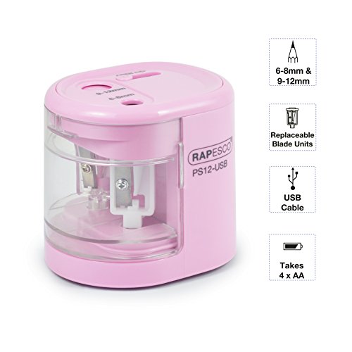 Rapesco 1446 PS12-USB Temperamatite Elettrico a Due Fori alimentato a pila o carica USB, Rosa