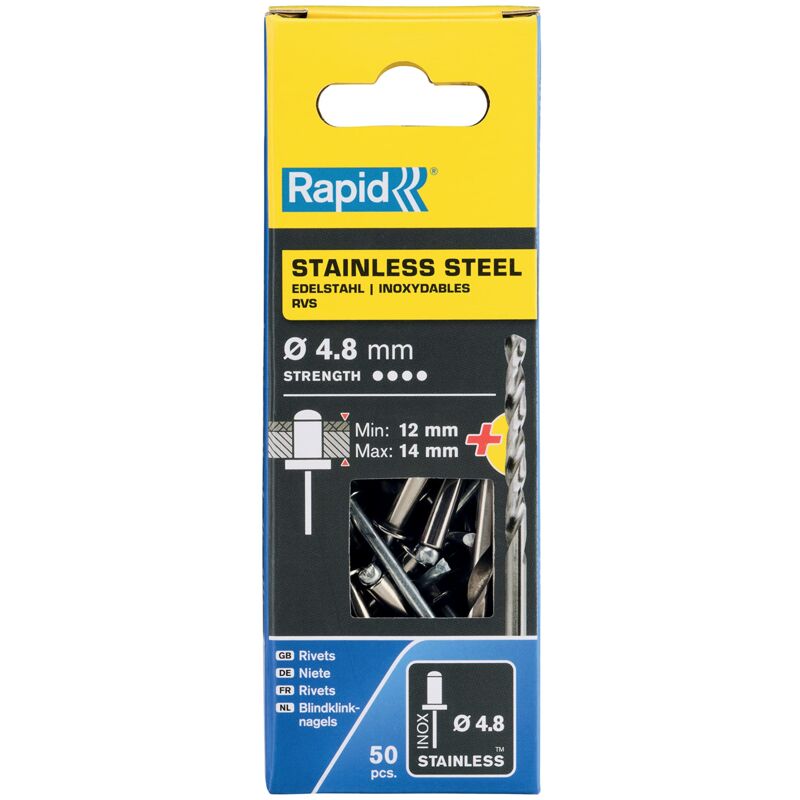 Specifiche: Dimensioni 4,8 x 18 mm, stretta: 12 - 14 mm, confezione da 50 pezzi La rapida rivetti sono realizzati in standard ISO 304 in acciaio inox e sono ideali per l' uso con strumenti mano Rivettatrice rapida. Ideale per tutte le applicazioni, questi rivetti garantire un fissaggio permanente resistente e di lunga durata. Sono particolarmente utile in aree umide e al di fuori, targhe, parafanghi, rivestimenti, tosaerba, serre, rivestimenti in metallo e copertura in lamiera. Ogni confezione viene fornito con un trapano. Adatta per il rp40 e PR100 Riveters. Caratteristiche: Dimensioni: 4,8 x 18 mm. Grip Gamma: 12 - 14 mm. Confezione: BLISTER DA 50. ptdrpd5000397