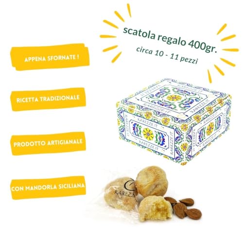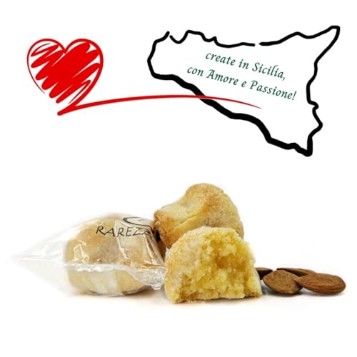 LA MANDORLA, prima di tutto! Preparate con ben il 40% di mandorla, un altissimo tenore di mandorla introvabile se non nelle migliori produzioni artigianali di paste di mandorla siciliane, altissimo tenore che ne fa sì lievitare il costo ma conferisce "il gusto" per eccellenza, quello ricco e deciso della mandorla siciliana.