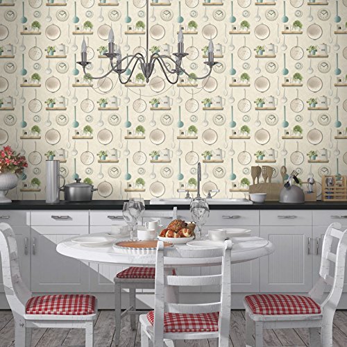 Rasch 307108, carta da parati in vinile con utensili da cucina, panna