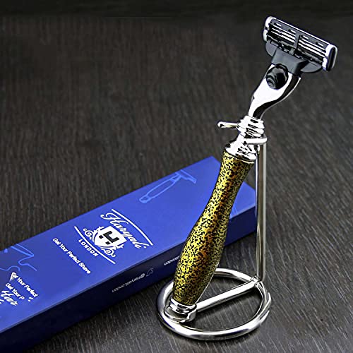 Set rasoio da barba da uomo in acciaio inox First Class Combo Stand - holder - Antique Gold Collection - adatto per la rasatura ad umido