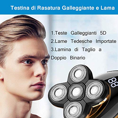 Rasoio Elettrico Uomo Barba Ricaricabile, IPX7 Impermeabile rasoio testa calva, 5 Testine Rotanti per Capelli Barba Naso Orecchie e Viso Pulito, Rifinitore a Scomparsa 5 in 1 Kit