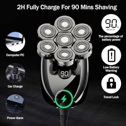 Display intelligente a LED: Il rasoio elettrico lavabile con display a LED mostra con precisione la percentuale di energia, l'avviso di batteria scarica e il blocco del viaggio. Tenere premuto per 3 secondi per bloccarlo per viaggiare in sicurezza o sbloccarlo. Questo rasoio per calvizie utilizza una batteria ad alta capacità che garantisce 90 minuti di funzionamento con una carica rapida di 2 ore.