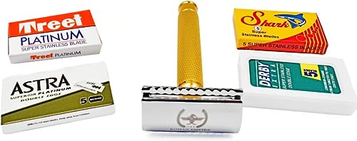 La confezione include 4 pacchetti di 5 lame per un totale di 20 lamette per consentire di provare il rasoio con lame differenti. Sono incluse le lamette Astra Platinum, Derby Extra, Shark Stainless, Treet