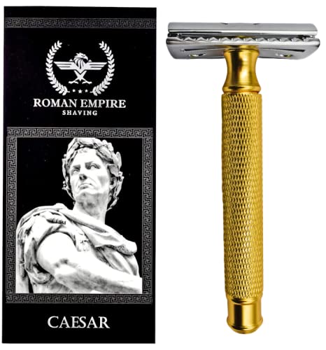 Rasoio di Sicurezza a Doppio Filo Caesar Gold di Roman Empire Shaving | Rasoio Classico | Safety Razor | Rasoio in Acciaio con Set di 20 Lamette da Barba (Astra-Derby-Shark-Treet)