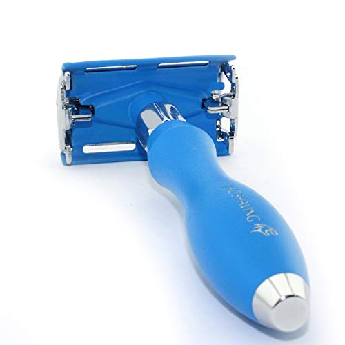 Il manico di lusso di colore blu è composto da alluminio di alta qualità e la testa è fatta di lega di zinco che lo rende più resistente. Durante la rasatura tenere le mani asciutte perché se si utilizza un rasoio di sicurezza, la mano scivolosa causerà lesioni. Ideale per tutti i capelli del corpo e facile rasatura senza problemi.