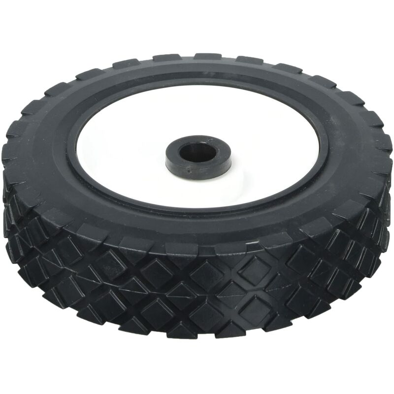 Ruota in plastica, struttura stabile, profilo a rombi. Diametro esterno in mm: 150. Lunghezza del mozzo in mm: 35. Larghezza della ruota in mm: 38,10. Diametro asse in mm: 14