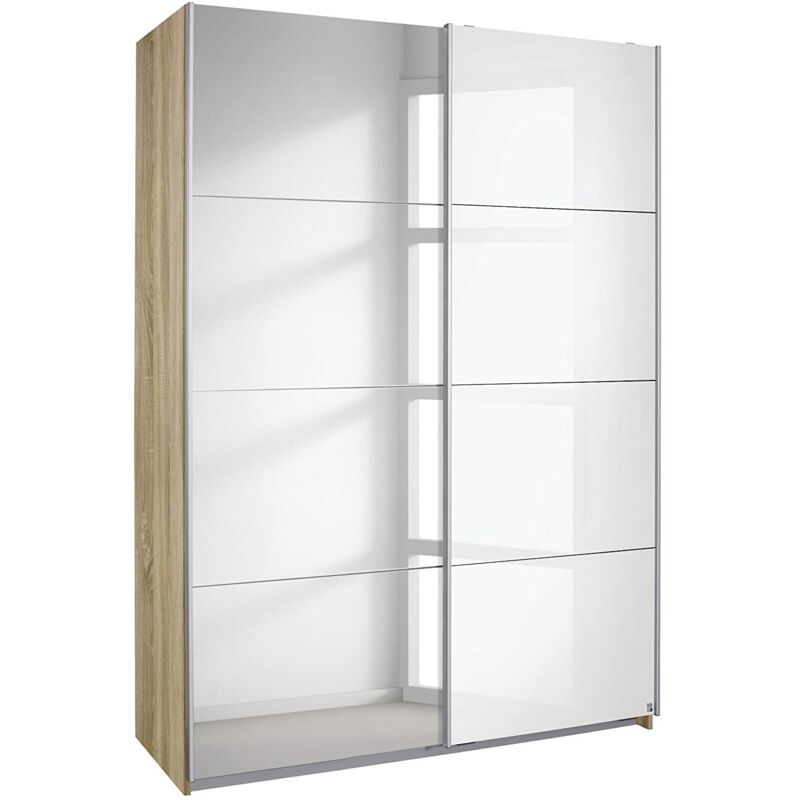 Molti conoscono il problema dei vestiti in giro, perché non c'è più spazio nel guardaroba. L'armadio Subito in rovere Sonoma offre una soluzione eccellente per la camera da letto. Infatti questo armadio con ante scorrevoli nelle dimensioni (larghezza x altezza x profondità) 136 x 197 x 61 cm garantisce un sacco di spazio e aiuta a mantenere l'ordine. L'interno dell'armadio è suddiviso in due metà, ciascuna con una misura di 67,5 cm. L'armadio è dotato di serie di un ripiano e di un appendiabiti in ogni elemento, ma può essere configurato individualmente con accessori coordinati in base alle esigenze. Un'anta dell'armadio è dotata di uno specchio. Questo non solo crea più spazio nella stanza/camera da letto, ma offre anche la possibilità di scegliere come abbinare i propri vestiti. La seconda anta dell'armadio è dotata di una parte frontale in vetro di colore bianco e garantisce quindi una piacevole atmosfera in camera da letto. Molto pratico: l'armadio con le sue ante scorrevoli è una
