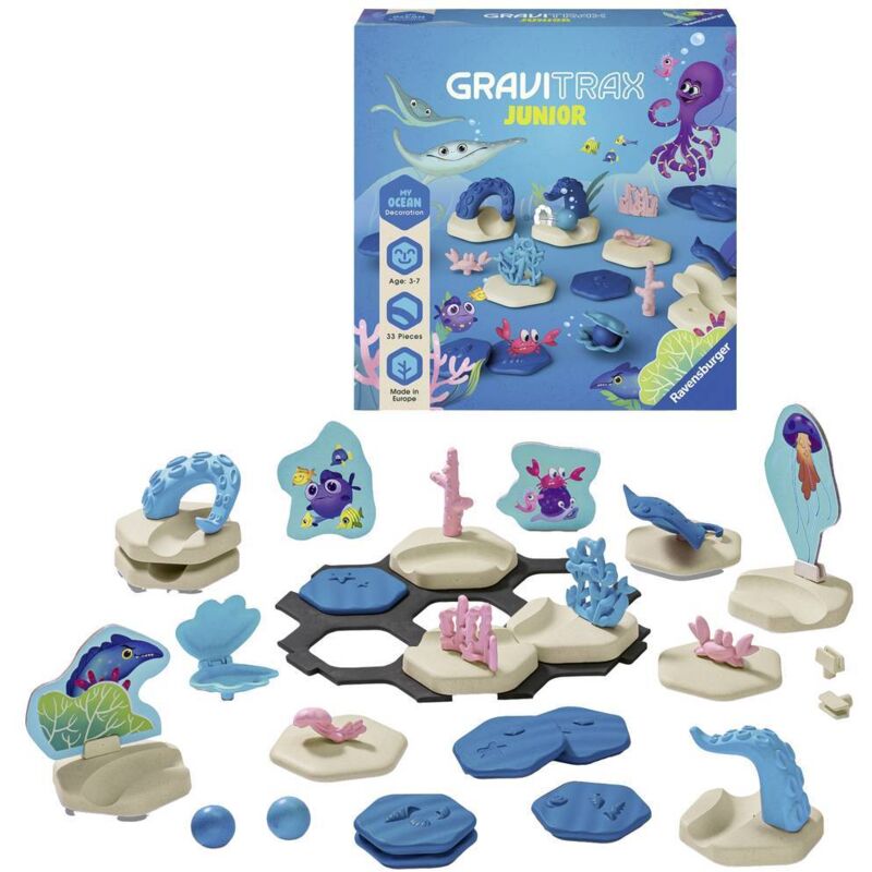 Dettagli tecnici Età minima consigliata (Min) 3 anno GraviTrax Junior Extension Ocean GraviTrax Junior consente ai bambini di età superiore a 3 anni di entrare in un mondo di piste a sfera a temaGraviTrax Junior è un sistema di piste a sfera interattivo per bambini di età superiore a 3 anni. I ragazzi e le ragazze creano i loro mondi di pista a sfera, che possono essere decorati in modo flessibile, in modo da creare mondi a tema personalizzati. Il divertimento di costruzione e di gioco si combina in questo modo.GraviTrax Junior può essere ampliato a piacere con estensioni con componenti o elementi speciali. I set con decorazioni a tema consentono ai bambini di creare i propri mondi, per un divertimento di gioco duraturo. GraviTrax Junior è un sistema di piste a sfera interattivo per ragazzi e ragazze di 3 anni e oltre: Con GraviTrax Junior i bambini non costruiscono solo semplici piste a sfera. Grazie alla decorazione personalizzata con elementi dal design accattivante, i bambini