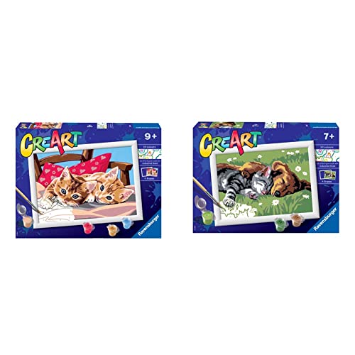 Ravensburger - CreArt Serie D: Gattini sul Cuscino, Kit per Dipingere con i Numeri, Contiene una Tavola Prestampata, Pennello & CreArt, Cane e Gatto Dolce Sonno, Gioco Creativo per Bambini