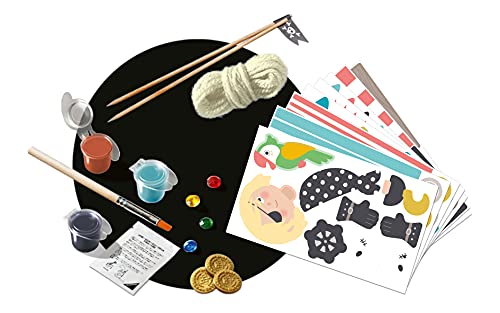 Il kit Pirati contiene tutto il necessario per realizzare con il bricolage simpatici personaggi, una nave dei pirati ed un buffo squalo che diventeranno i protagonisti di divertentienti giochi