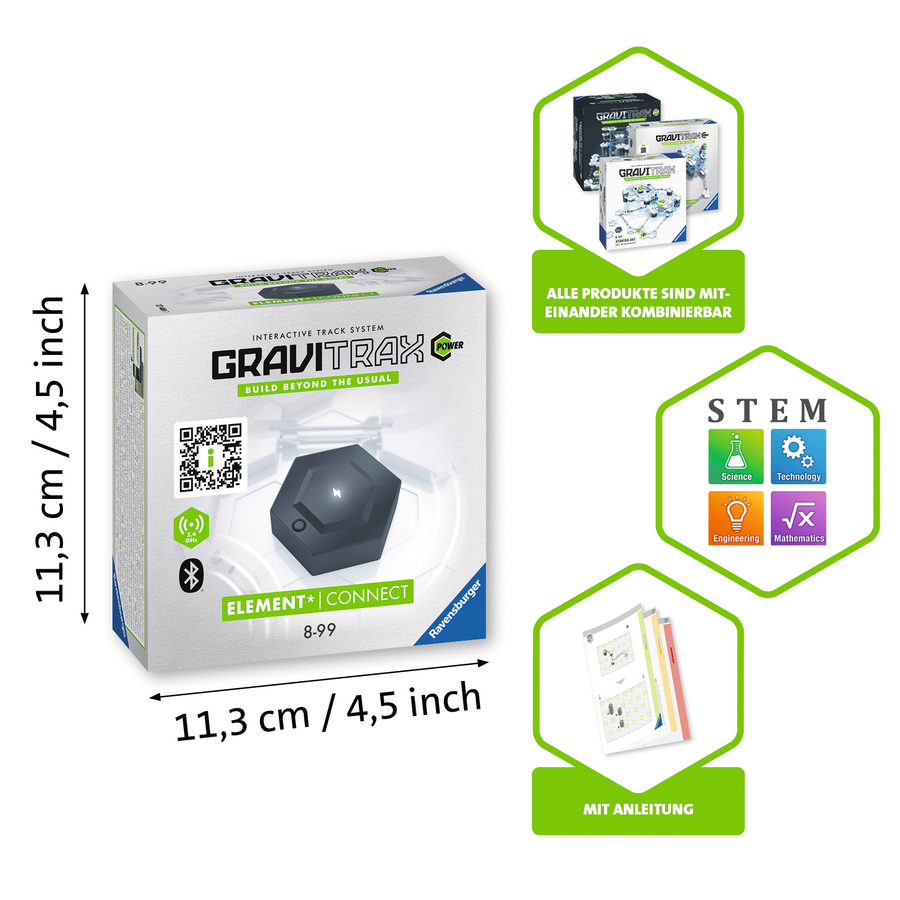 Dettagli del prodotto: Età: da 8 anni Con il GraviTrax Element Connect, tutti possono controllare le piste di POWER tramite app, programmarle e scoprire altre entusiasmanti funzioni. Funzioni interessanti come il telecomando, la programmazione, la misurazione del tempo o il suono assicurano un divertimento vario e consentono un'introduzione giocosa al mondo della programmazione.