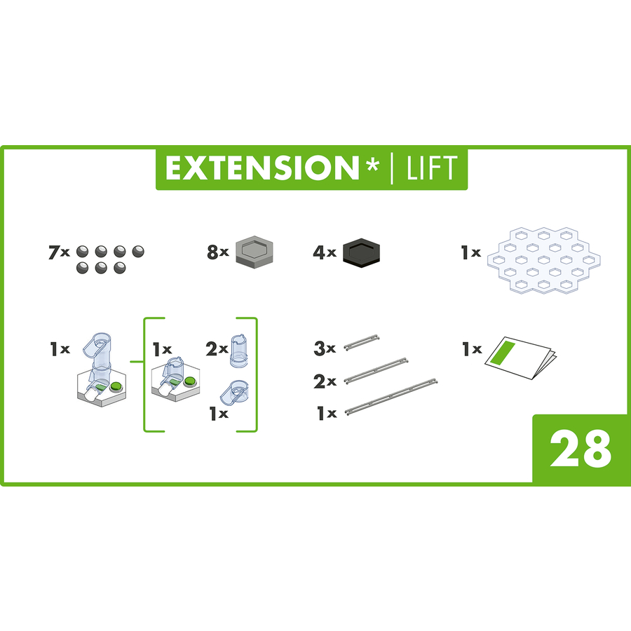 Dettagli del prodotto: Età: da 8 anni L'Extension Lift solleva le palline in modo flessibile a nuove altezze nella pista GraviTrax L'Extension Lift contiene molti componenti di base diversi e 7 palline per ampliare la pista di biglie Abbinato a qualsiasi Starter Set GraviTrax, l'Extension Lift aggiunge ancora più varietà e divertimento con le palline all'universo GraviTrax