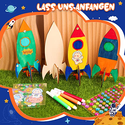 Set di 16 razzi in legno fai da te in legno, con penne in 12 diversi colori, 5 tatuaggi per bambini, 24 simpatici adesivi a forma di cartone animato, 1 adesivo diamantato colorato, artigianato in legno fai da te per soddisfare le esigenze creative del tuo bambino o studente