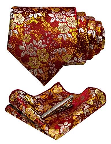 RBOCOTT Cravatta floreale e tasca quadrata, set di clip per uomo, Giallo/Oro/Borgogna, Medium